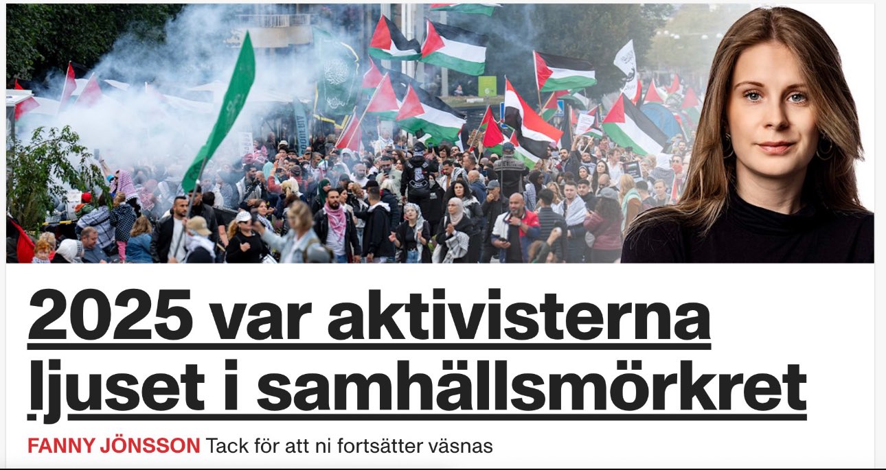 När Aftonbladets ledarsida på nyårsafton sammanfattade året med rubriken ”2025 var aktivisterna ljuset i samhällsmörkret” valde redaktionen att illustrera texten med en bild från en Palestinademonstration i Göteborg. På bilden syntes Hamasflaggor, bandanas och symboler för flera terrorstämplade organisationer.
