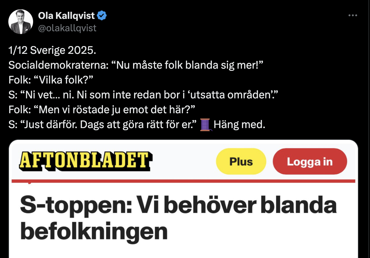 Ola Källqvists virala tråd: "Detta är inte demokrati – det är vansinne" I en skarp och bitvis svidande tråd på X (f.d. Twitter) riktar Ola Källqvist förödande kritik mot Socialdemokraternas senaste integrationsutspel. Bakgrunden är partiets återkommande krav på att "blanda" befolkningen i syfte att bryta segregationen – ett krav som allt oftare landar i ett hot mot den vanliga svensken: flytta eller bli påtvingad social oro.
