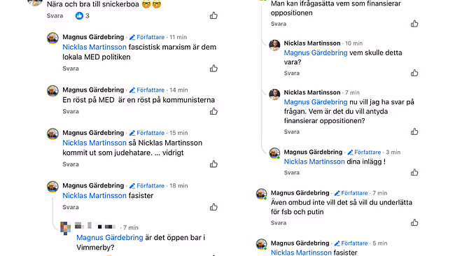 ”Så Nicklas Martinsson kommit ut som judehatare. … Vidrigt.” ”Fascistisk marxism är den lokala MED-politiken.”