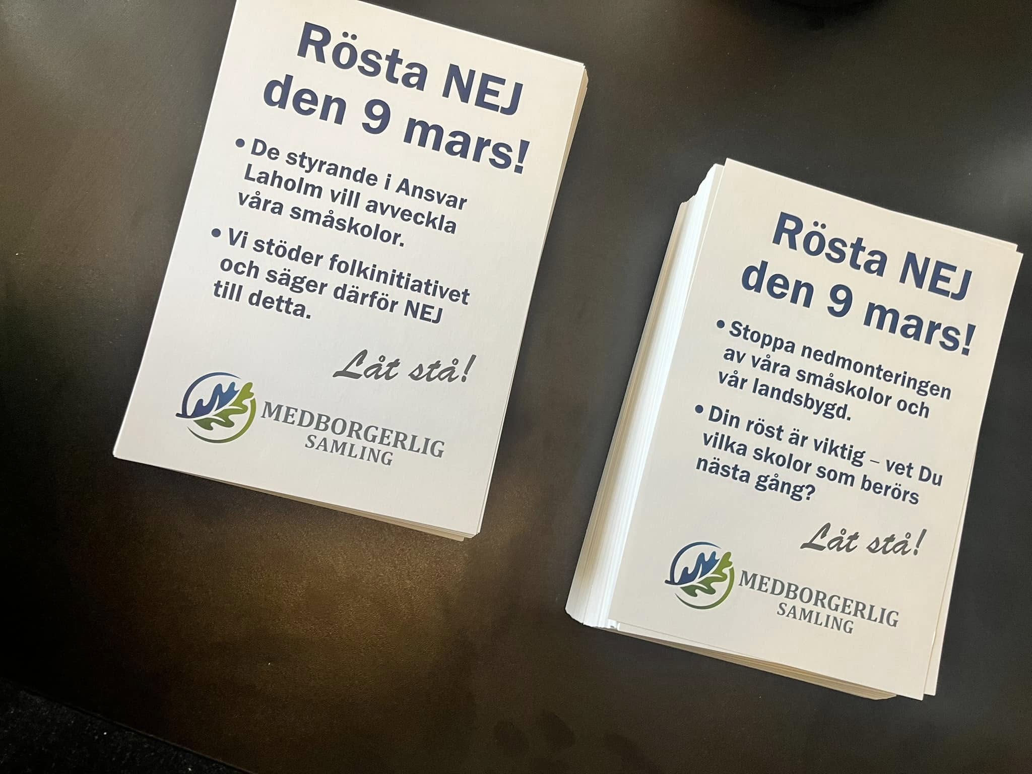 Medborgerlig Samling: "Ett svek mot demokratin" I ett uttalande inför folkomröstningen skrev MED Laholm på sin Facebook-sida: "Folkomröstningen den 9 mars gäller om kommunen ska återöppna de båda byskolorna i Ahla och Genevad. Styret i Laholm, som ironiskt nog kallar sig 'Ansvar för Laholm', deklarerar nu öppet att de tänker strunta i utfallet av folkomröstningen. Detta är ett hån mot demokratin."