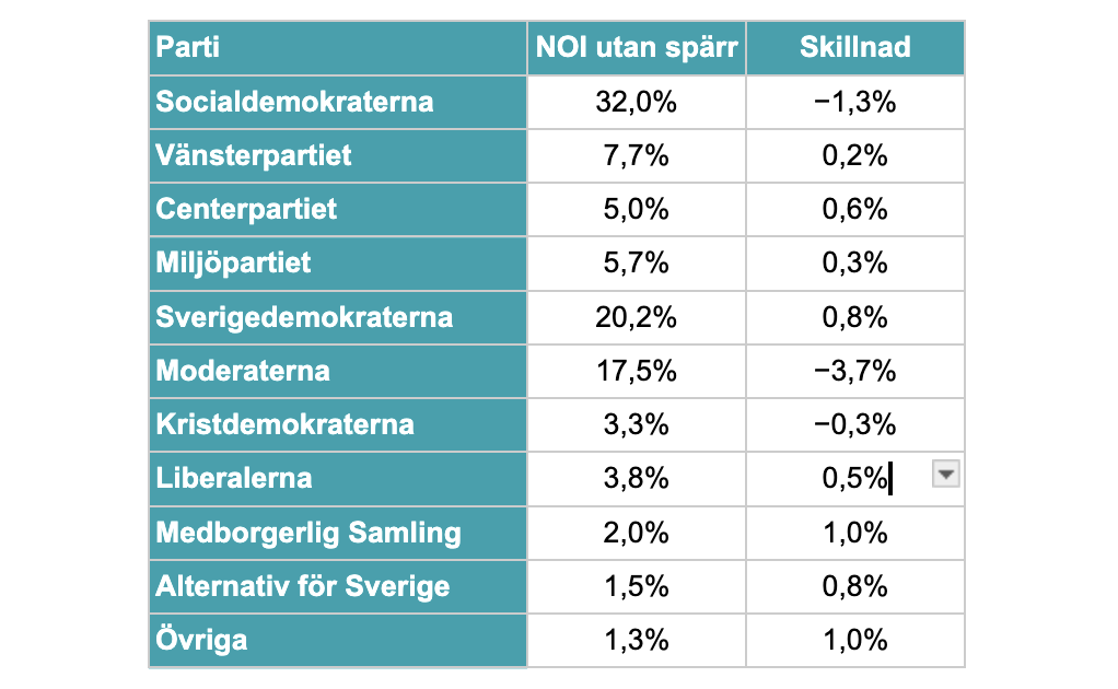 Strategiskt röstande döljer väljarnas egentliga preferenser Undersökningen, genomförd av Norstat på uppdrag av NOI, visar att flera småpartier skulle vinna mark om spärren togs bort. Medborgerlig Samling fördubblas från 1,0 till 2,0 procent, Alternativ för Sverige ökar från 0,7 till 1,5 procent – och kategorin "övriga" fyrdubblas från 0,3 till 1,3 procent. Samtidigt tappar Moderaterna 3,7 procentenheter, vilket tyder på att många väljare håller för näsan och röstar strategiskt i rädsla för att deras egentliga favorit inte ska "komma in".