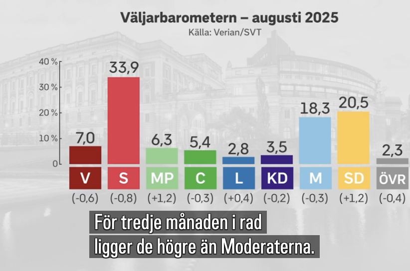 SD går om M – men den stora frågan döljs SVT/Verians nya augustimätning visar att Sverigedemokraterna nu går om Moderaterna och är näst största parti. Socialdemokraterna behåller förstaplatsen, medan Liberalerna inte får något lyft av sitt partiledarbyte. Men bakom rubrikerna finns en annan, minst lika viktig utveckling: andelen osäkra väljare ligger kvar på rekordhöga nivåer.