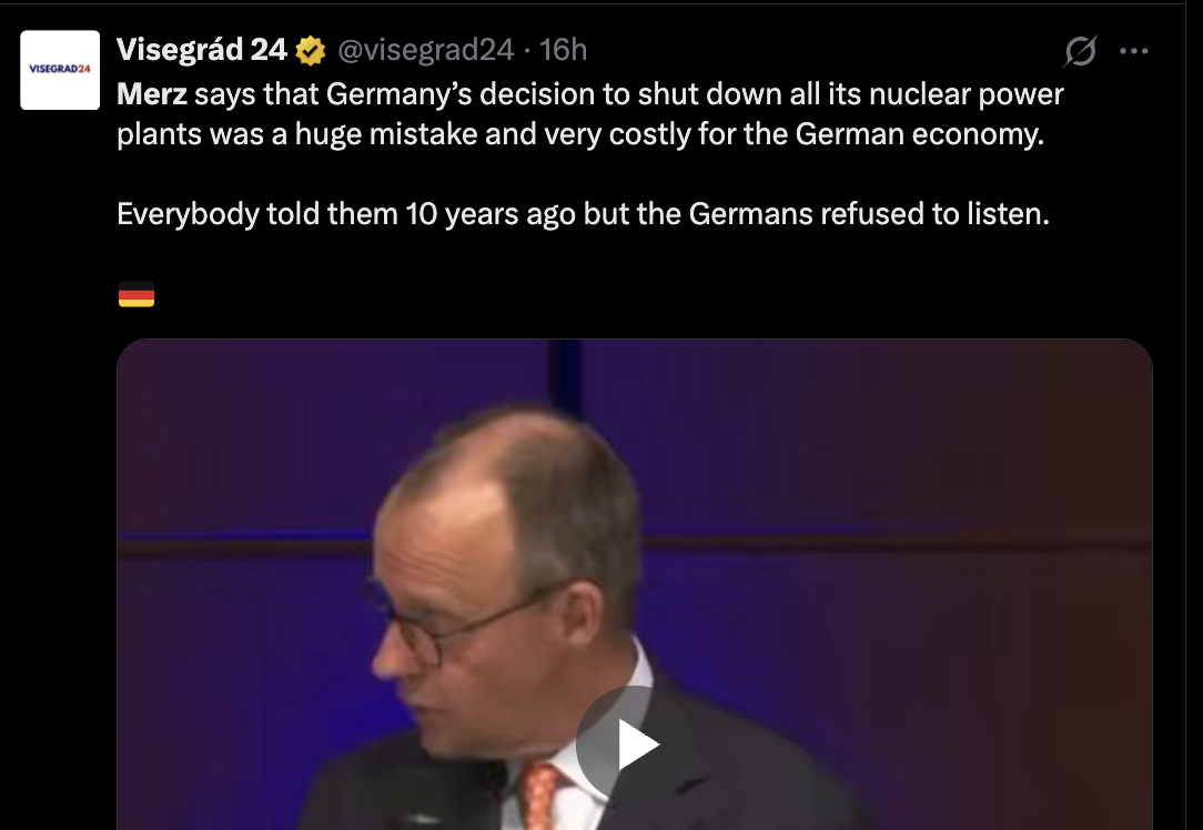 Tystnaden efter Merz energierkännande Det är ett ovanligt tydligt uttalande från Europas mäktigaste land. Tysklands förbundskansler Friedrich Merz har öppet kallat beslutet att avveckla kärnkraften för ett ”allvarligt strategiskt misstag”.