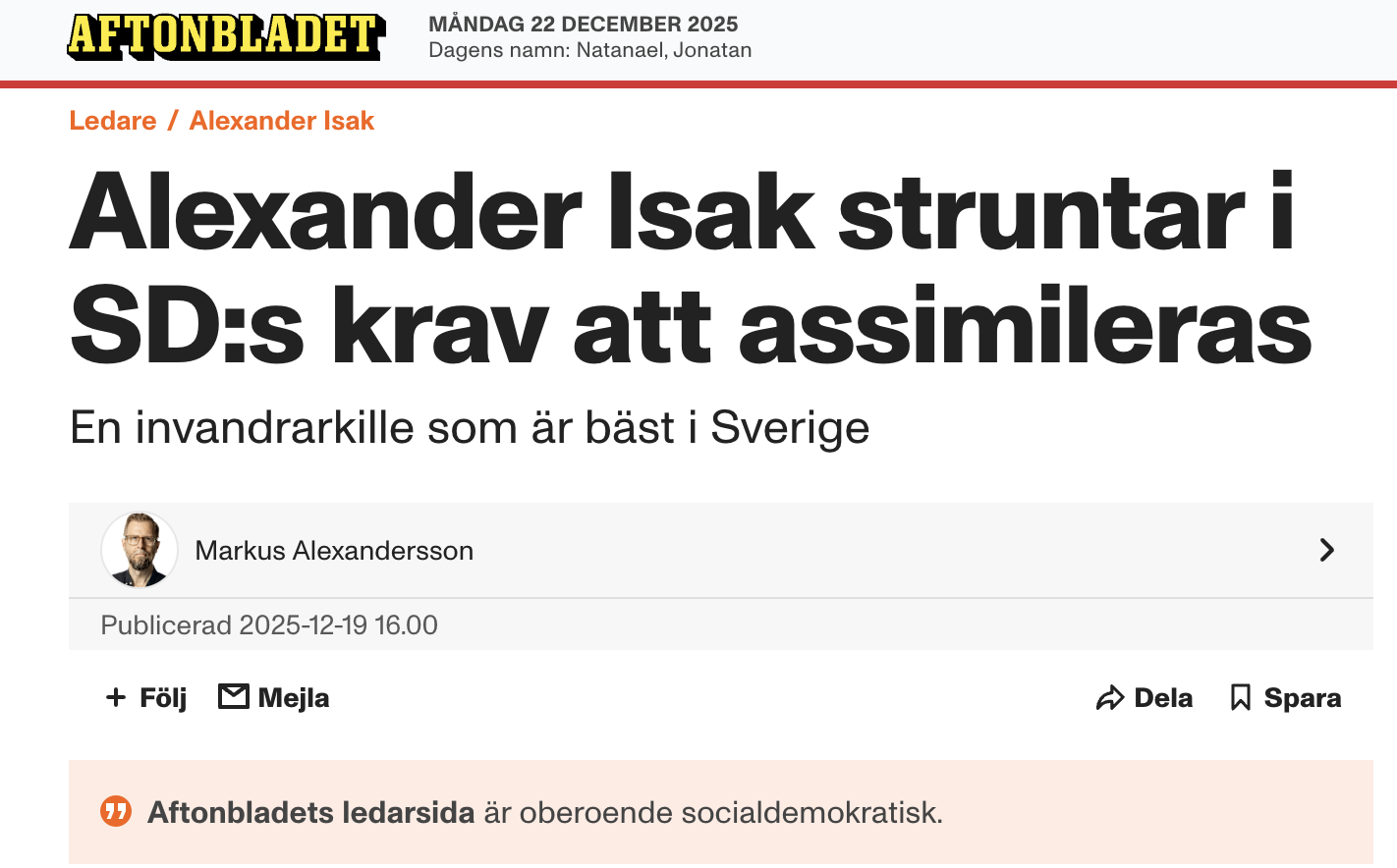Att då använda Alexander Isak som motargument mot krav på assimilation är inte bara intellektuellt ohederligt – det är ett sätt att blunda för orsakerna till problemen.